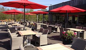 Het westelijk terras geeft een zicht op het speelplein, go-carts of de spelende kinderen terwijl u van een gezellige babbel en drankje geniet.