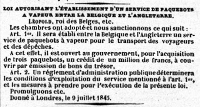 Het project werd in de Kamerzittingen van 1845 besproken en bij Koninklijk Besluit van 9 juli 1845 werd beslist om in Oostende een nieuwe lijn op te starten tussen Oostende en Dover voor het vervoer van reizigers en postzendingen. Hiervoor stelde de schatkist een bedrag van één miljoen ter beschikking om drie stoomschepen aan te kopen en de nodige voorbereidingen in de haven te starten.