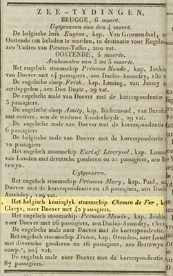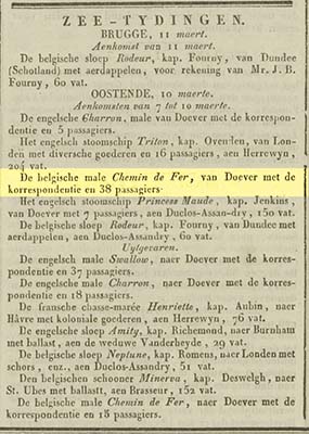 Op 25 februari 1846 publiceerde de Belgische Staat al het afvaartschema van de Chemin de Fer voor de maand maart. Het schip zou telkens op dinsdag en vrijdag om 08u30 ’s morgens naar Dover afvaren. De terugreis uit Dover op donderdag en zondag wanneer het getijde het toelaat. In bijgaande publicatie is duidelijk te zien dat voor de maand maart telkens de uren zijn aangepast aan de getijden.