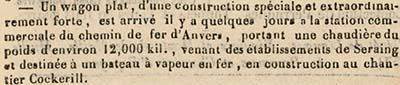 Pas in januari 1847 kwam de 12 ton wegende stookketel uit Seraing aan per trein te Antwerpen.