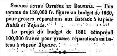 Ook politiek was er dat jaar beroering in de Kamer. Het Zeewezen vroeg aan de overheid een budget van 150 000 Fr. om aan de drie schepen de nodige herstellingen te doen. Het in bedrijf houden van de drie stomers werd al na 12 jaar lastig en de ingenieurs hadden al in 1858 een plan opgesteld om aanpassingen te doen. De vraag naar dat groot budget was de laatste fase dat de drieling een volledige verjongingskuur moest geven en terug in optimale bedrijfstoestand moest brengen zoals ze nog nooit waren geweest. Voor de Topaze was een bedrag van 100 000 Fr. voorzien.