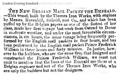 Omdat de Diamant in herstelling moest deed de Emeraude al zijn eerste reis naar Dover op 27 maart 1859 en nam 15 reizigers mee. In de Engelse krant, de London Evening Standard van 2 april wilde men over die eerste reis toch wat kwijt. De Emeraude had de eerste reis gedaan in zes uur in gunstige omstandigheden. Terwijl de meest nieuw gebouwde stomers er in die tijd al in slaagden om de overtocht in soms 4 uur te maken. De scheepsbouwer voegde er aan toe dat ze het schip gebouwd hebben maar niet hebben ontworpen.