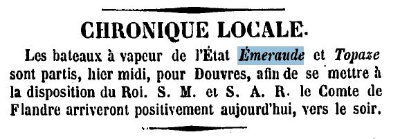 Op 2 mei 1859 kon de Emeraude al de Diamant naar Cockerill slepen voor herstellingen. Die zomer werd het schip meerder malen ter beschikking gesteld van de Koninklijke familie of de Koning zelf. Op 6 oktober mocht de Emeraude de Graaf van Vlaanderen begeleiden voor een reis naar Dover met heel wat hoog geplaatsten aan boord. Op de terugreis werd de Koninklijke Hoogheid via Vlissingen naar Rotterdam gebracht om aanwezig te zijn op de inhuldiging van de spoorwegen en wat later naar Amsterdam te reizen om de Koninklijke familie te ontmoeten.
