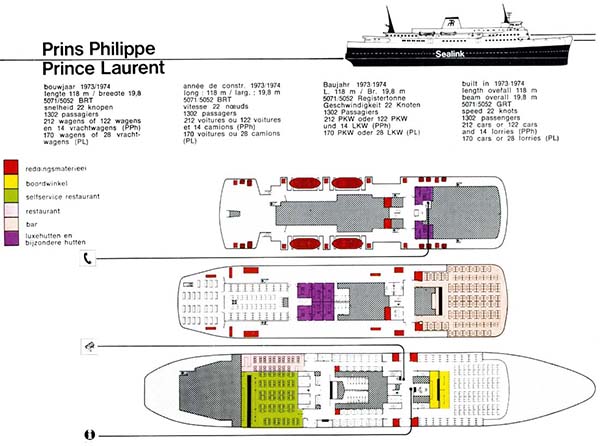 The ship was more or less adjusted compared to the sister ship Prins Philippe as the space for freight was increased. Compared to the 174 meter on the PPH. the Prince Laurent had 380 meter freight space available. More Multi-Purpose. This aloud to load around twenty peaces of freight. Indeed in function of the number of cars booked as hanger decks needed to be lowered. In preparation of embarkation the crew need to prepare the ship according to the booked type of vehicles. The PL could take 170 cars maximum and had a capacity of 1302 passengers.